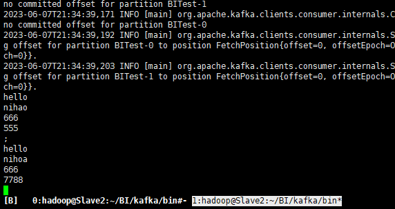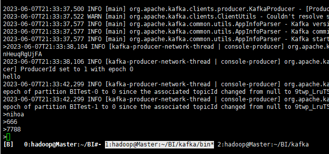 2.启动多个生产者kafka-console-producer.sh –broker-list Master:9092,Slave1:9092,Slabe2:9092,Slave3:9092 –topic BITest