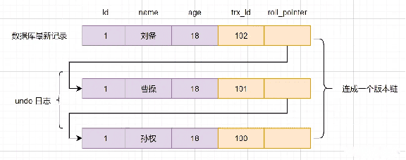 多个事务并行操作某一行数据时,不同事务对该行数据的修改会产生多个版本,然后通过回滚指针(roll_pointer),连成一个链表,这个链表就称为版本链。如下所示: