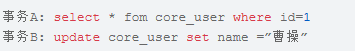 隔离级别设置为读已提交(RC),事务 A 和事务 B 同时对 core_user 表进行查询和修改操作。