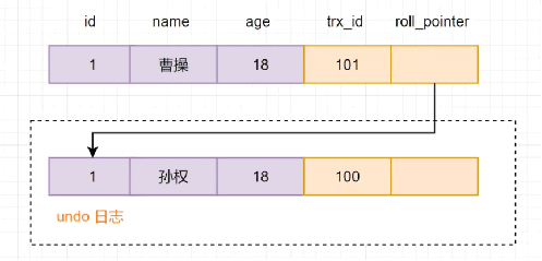 这时候,版本链roll_pointer跳到下一个版本,trx_id=100这个记录,再次校验是否可见,显然trx_id=100这个记录,对于当前事务是可见的,所以两次查询结果,都是 name=孙权的那个记录。